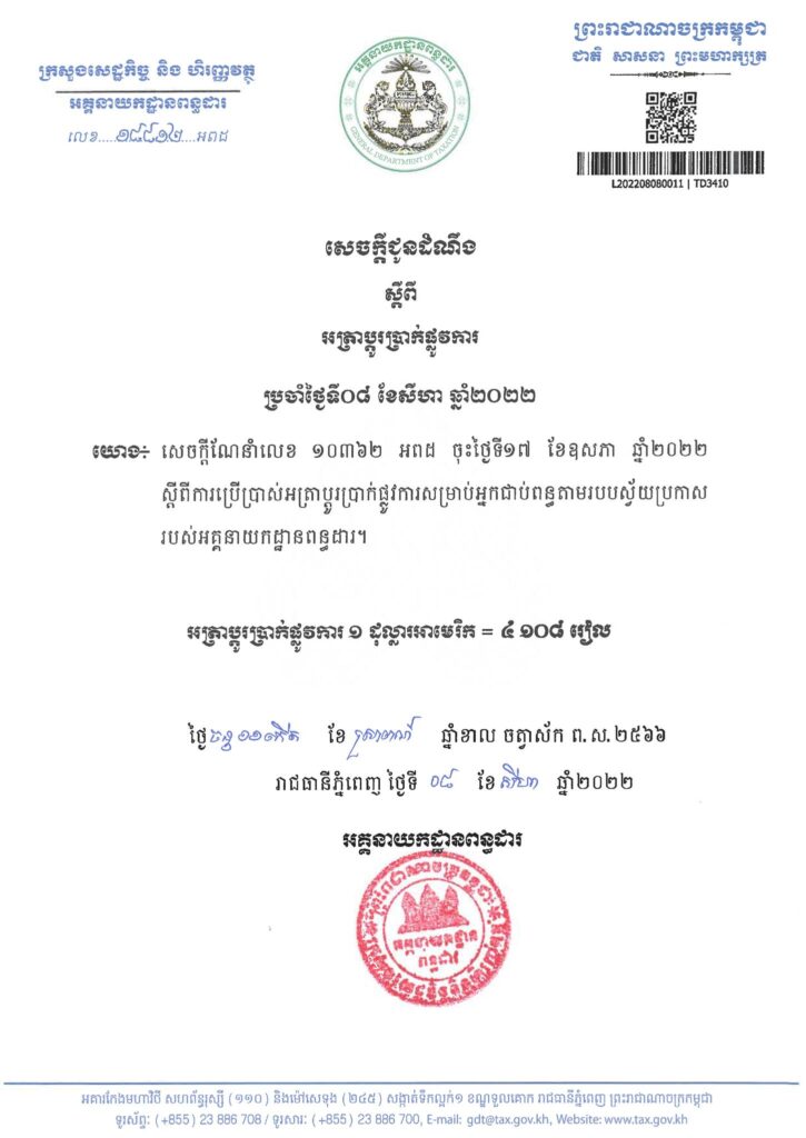 សេចក្តីជូនដំណឹង ស្តីពី អត្រាប្តូរប្រាក់ផ្លូវការ ប្រចាំថ្ងៃទី០៨ ខែសីហា ឆ្នាំ២០២២ 08-Aug-2022 Hanthong Consultant