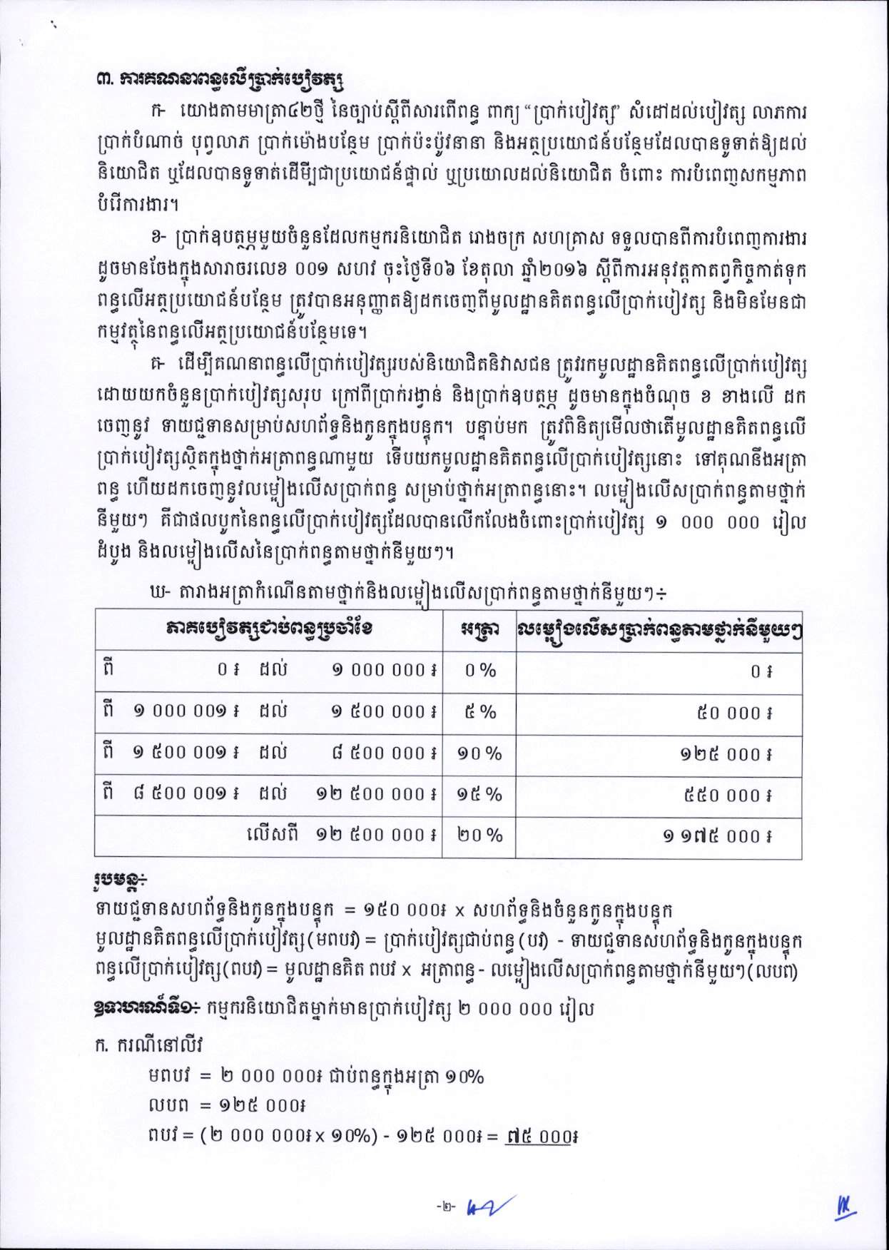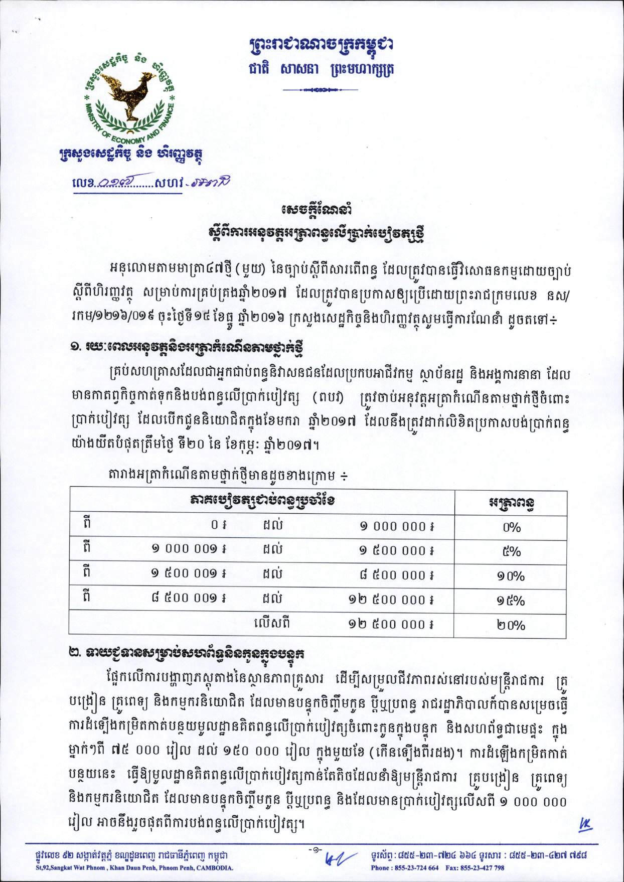 សេចក្តីជូនដំណឹងស្តីពីសេចក្តីណែនាំស្តីពីការអនុវត្តអត្រាពន្ធលើប្រាក់បៀវត្សថ្មី 09-Jan-2017 Hanthong Consultant សេចក្តីណែនាំស្តីពីការអនុវត្តអត្រាពន្ធលើប្រាក់បៀវត្សថ្មី >> ចុចទីនេះ << ដើម្បីទាញយកឯកសារ